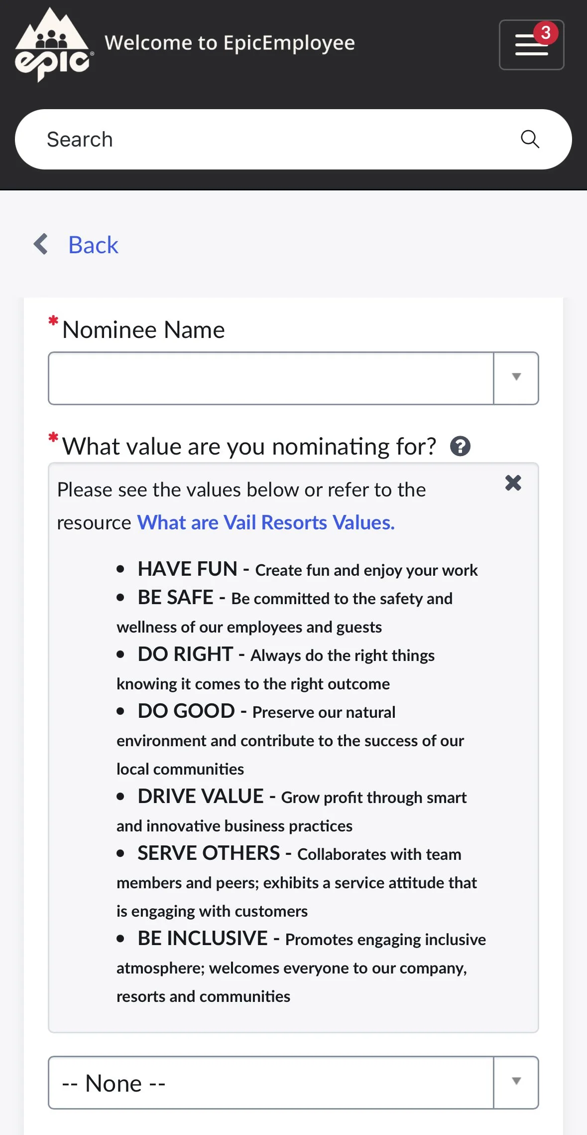 4. You will also have to select which of Vail’s core values you are nominating them for