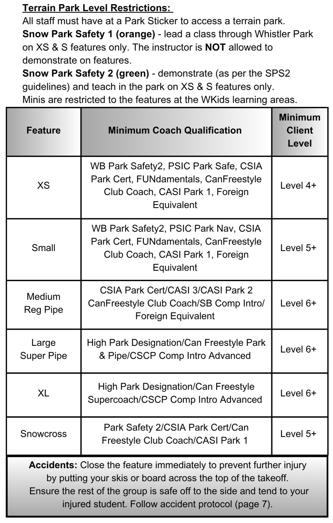 Park Safety has been in place since around 2016 and has evolved over the last few years. At WB we have some serious terrain park features that go beyond the scope of the traditional CSIA and CASI courses so we developed this designation to help support “how to teach in terrain oarks. This includes tactical as well as technical aspects that should be considered, assessed and developed in our students before taking them in the park itself.
