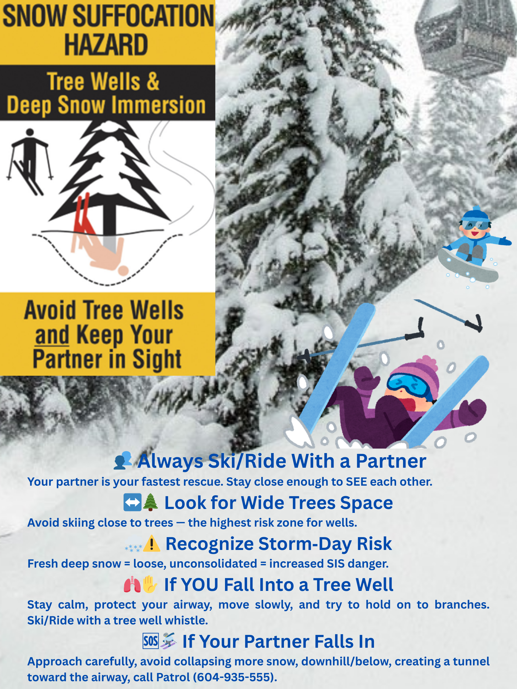 These resources will help you understand how tree wells form, why deep‑snow immersion is so dangerous, and what steps you can take to stay safe. Building awareness and practicing good partner habits are the most important tools you have to prevent Snow Immersion Suffocation incidents. Let’s keep each other safe out there.